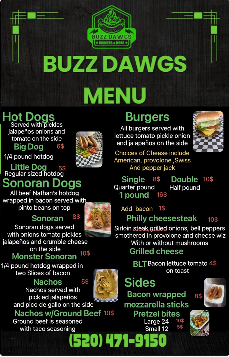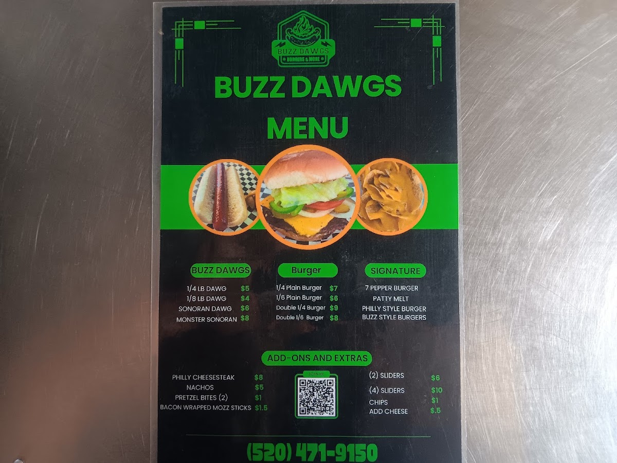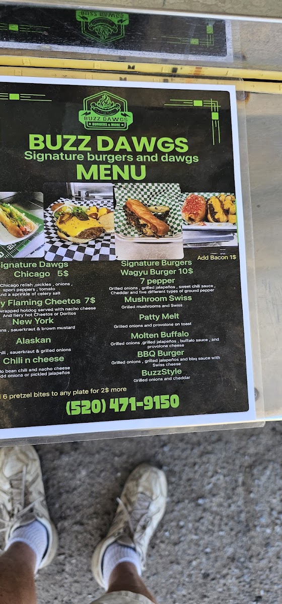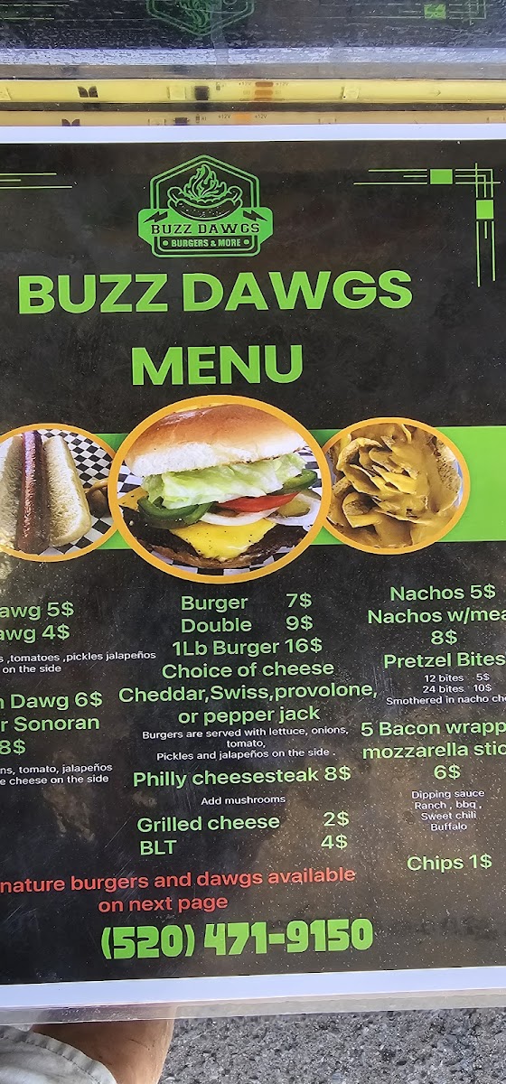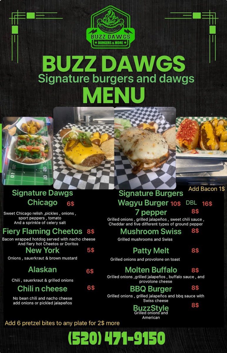 The menu at Buzz Dawgs LLC in Sierra Vista offers a delicious variety of comfort food, with something for every craving. Their burgers come in different options such as the 1/4 lb burger, Double Burger, or the flavorful 7 pepper burger. You can also customize your burger by adding bacon or an extra pattie. For hot dog lovers, the Big Dawg and Lil Dawg are staples, while the Chicago Dog and the spicy Fiery Flaming Cheetos Dog provide unique twists. Their Philly Cheesesteak is another highlight, offering a satisfying sandwich for meat lovers. If you're in the mood for something crunchy, try their Nachos or Nachos with meat for a filling snack. The sides are perfect for sharing, with options like Pretzel Bites, Bacon-wrapped mozzarella sticks, and Large Pretzel Bites. For those looking for signature creations, Buzz Dawgs serves up inventive offerings such as the Chicago Dawg, Fiery Flaming Cheetos Dawg, New York Dawg, and Alaskan Dawg, along with rich Chili n Cheese toppings. Their signature Wagyu Burger, Patty Melt, and BBQ Burger bring the heat and flavor to satisfy your hunger. Whether you're in the mood for something classic or a bold new flavor, Buzz Dawgs LLC has it all!